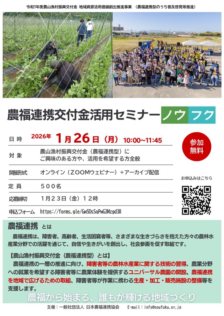 この度、農山漁村振興交付金(農福連携型)にご興味のある方や、活用を希望する方全般を対象に、農福連携交付金活用セミナーを以下のとおり開催します。