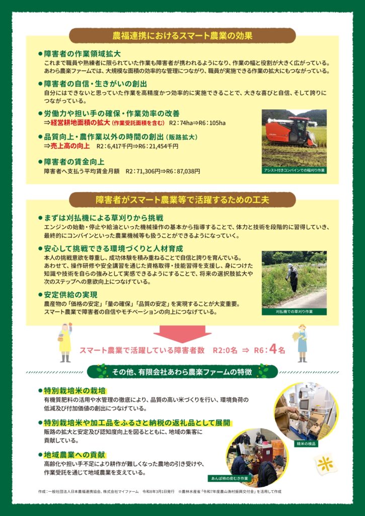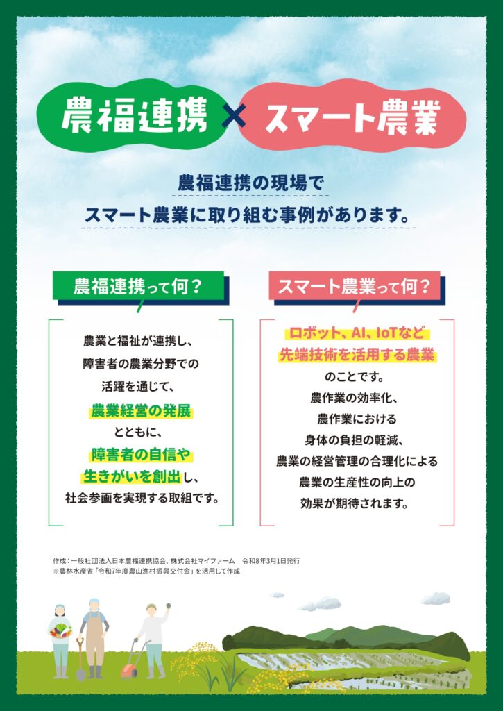 「農福連携×スマート農業」PR資料 投稿日: 2026年3月16日2026年3月16日 投稿者: k_nakatani 農福連携の現場でスマート農業に取り組む事例があります。この度、「農福連携×スマート農業」PR資料を作成しました。 👇以下の資料はこちらからもご覧いただけます。 http://noufuku.or.jp/wp-content/uploads/2026/03/2824cbe6737520c964c35af2826dc2f9-1.pdf